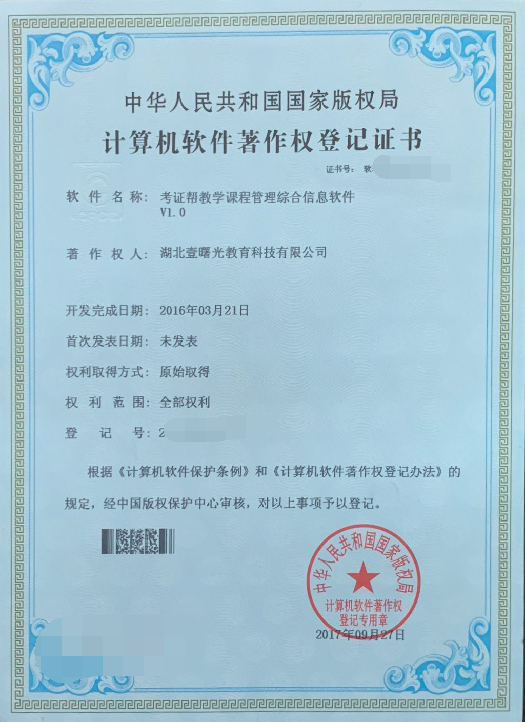 2017年9月27日,我公司與考證幫APP相關的1項軟件著作權獲批。